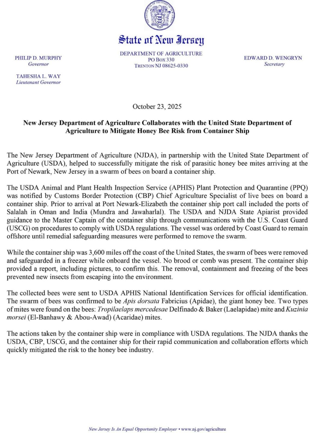 وبالتنسيق بين وزارة الزراعة الأمريكية (USDA)، ووزارة الزراعة في نيوجيرسي (NJDA)، وخفر السواحل الأمريكي (USCG)، تم تنفيذ إجراءات عاجلة لمنع تسرب النحل أو الطفيليات إلى البيئة المحلية.