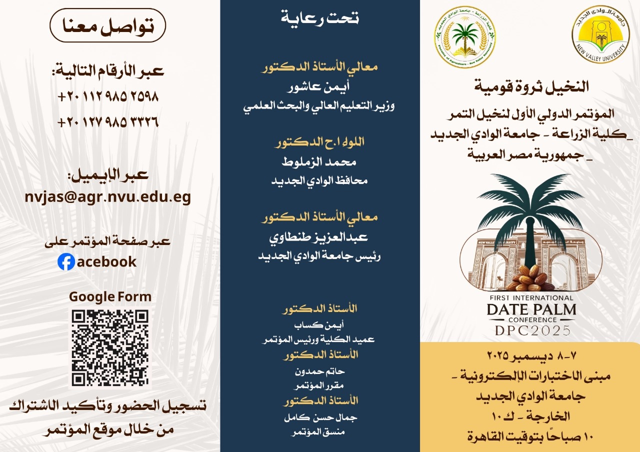 تستعد كلية الزراعة بجامعة الوادي الجديد لاستضافة المؤتمر الدولي الأول لنخيل التمر (DPC2025) يومي 7 و8 ديسمبر 2025، برعاية علاء فاروق وزير الزراعة واستصلاح الأراضي، والدكتور أيمن عاشور وزير التعليم العالي والبحث العلمي، ومحافظ الوادي الجديد، اللواء أ.ح. الدكتور محمد الزملوط، وفق تصريحات الدكتور حاتم حمدون، وكيل الكلية ومقرر المؤتمر. وتأتي هذه الفعالية في إطار تعزيز البحث العلمي وتطوير صناعة التمور وربط الأبحاث النظرية بالتطبيق العملي.
