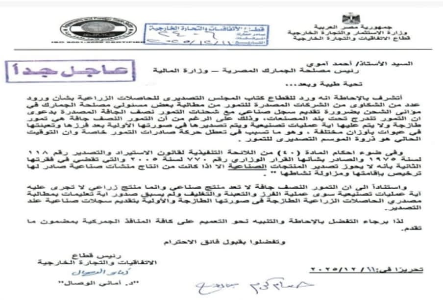 كما أكد أنه لم تصدر سابقًا أي تعليمات تُلزم مصدّري الحاصلات الزراعية الطازجة، في صورتها الأولية، بتقديم سجلات صناعية عند التصدير.