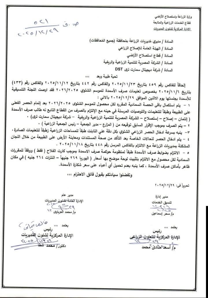 وأكدت اللجنة أن صرف الأسمدة يتم طبقًا للقطاع التابع له طالب الصرف، سواء كان (الائتمان – الإصلاح – الاستصلاح – الشركة المصرية للتنمية الزراعية والريفية – شركة ديجيتال سمارت تري)، مع الالتزام الكامل بالقواعد المنظمة لكل قطاع، بما يضمن إحكام الرقابة ومنع أي تلاعب في منظومة التوزيع.