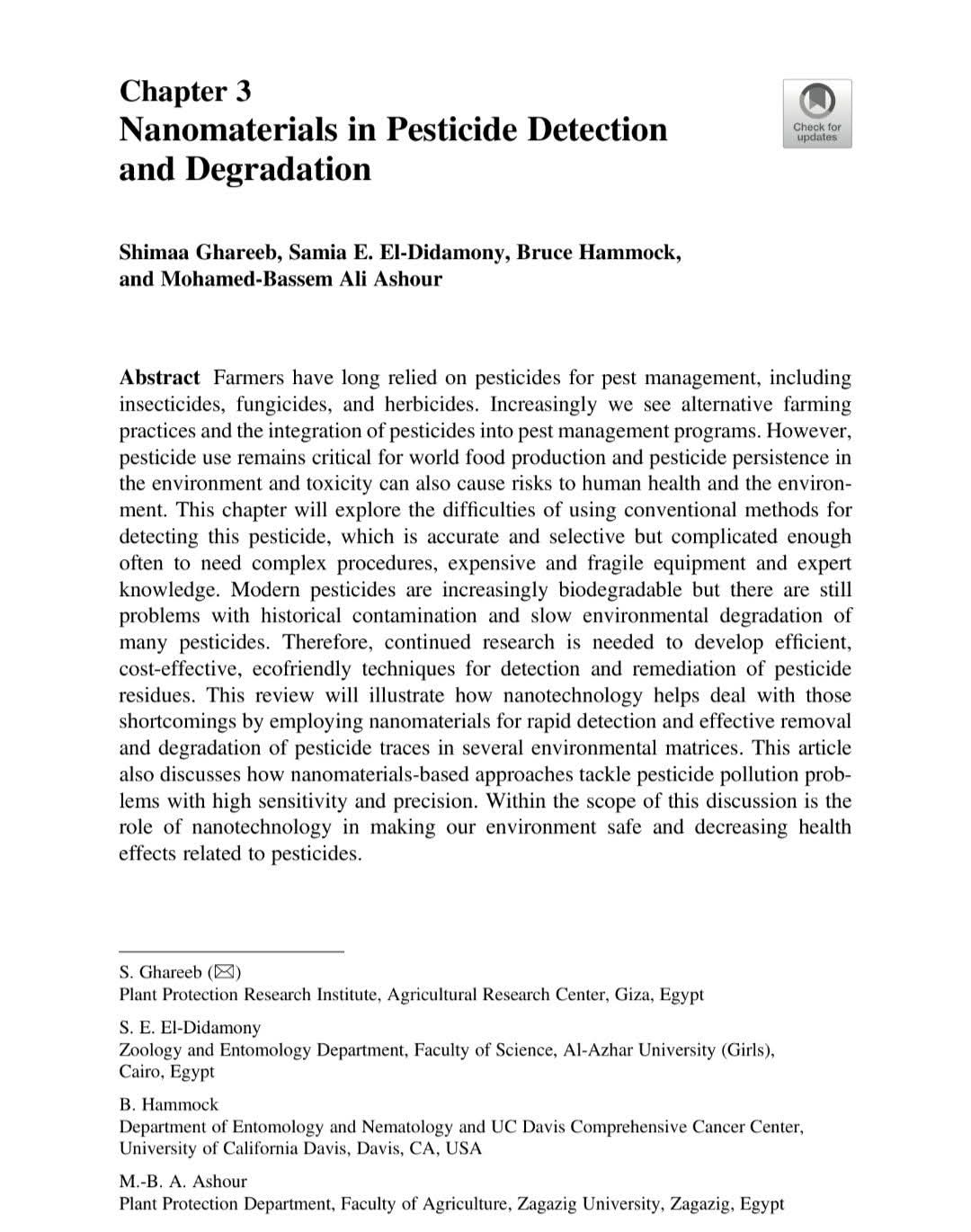 قدم البحث باحثون من مركز البحوث الزراعية، جامعة الأزهر، جامعة الزقازيق، وجامعة كاليفورنيا ديفيس، رؤية حول كيفية تغلب "المواد النانوية" على هذه العوائق، حيث تتميز الحلول القائمة على النانو بالقدرة على الرصد السريع عبر الكشف الفوري والدقيق عن آثار المبيدات في الأوساط البيئية المختلفة، التخلص الفعال من خلال تحسين عمليات إزالة وتحلل متبقيات المبيدات بطريقة آمنة والحساسية العالية التي تتطلب قدرة فائقة على رصد أصغر الجزيئات الملوثة بدقة متناهية.