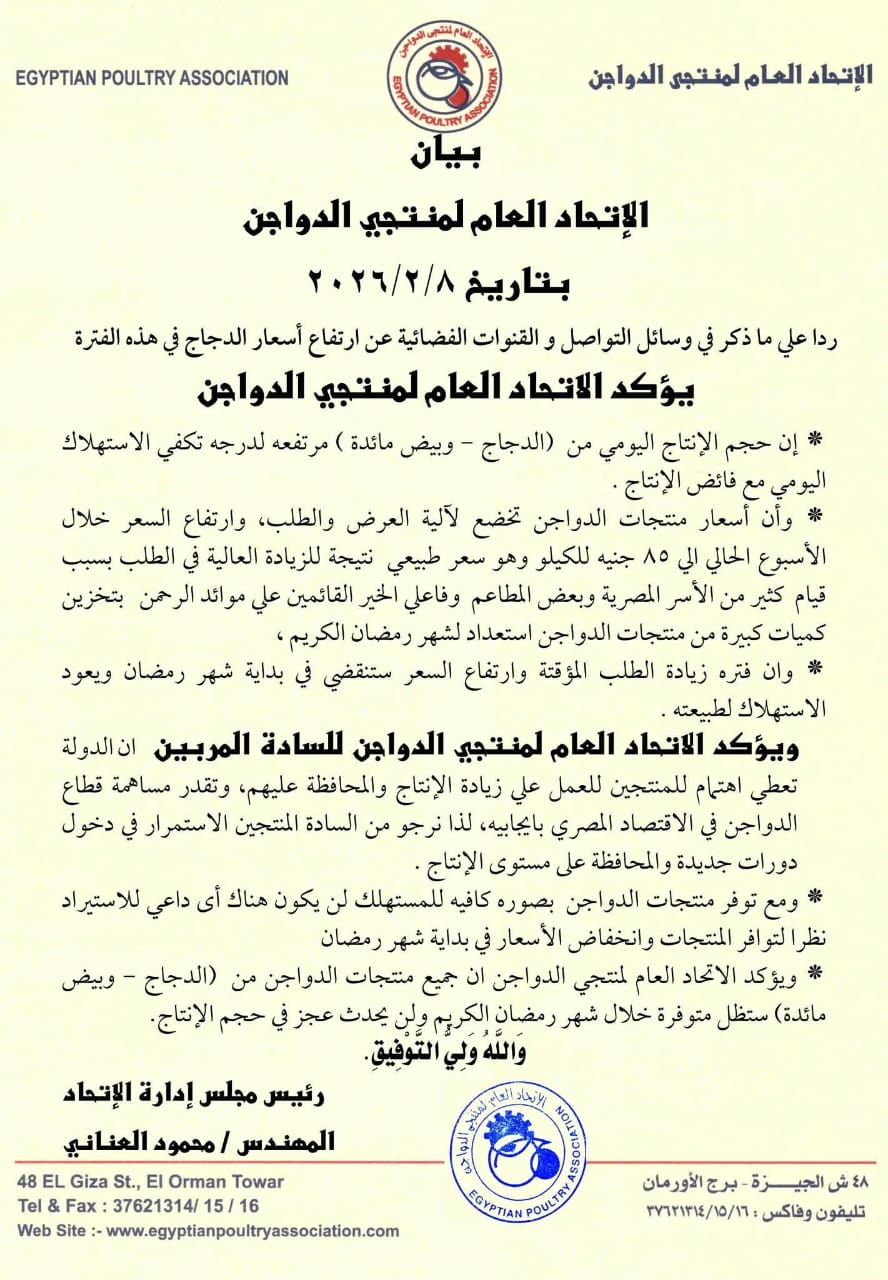 أصدر الاتحاد العام لمنتجي الدواجن بيانًا بتاريخ 8 فبراير 2026، ردًا على ما تم تداوله في وسائل التواصل الاجتماعي والقنوات الفضائية بشأن ارتفاع أسعار الفراخ خلال الفترة الحالية، مؤكدًا أن حجم الإنتاج اليومي من الدجاج وبيض المائدة مرتفع بدرجة تكفي الاستهلاك اليومي، مع وجود فائض في الإنتاج.