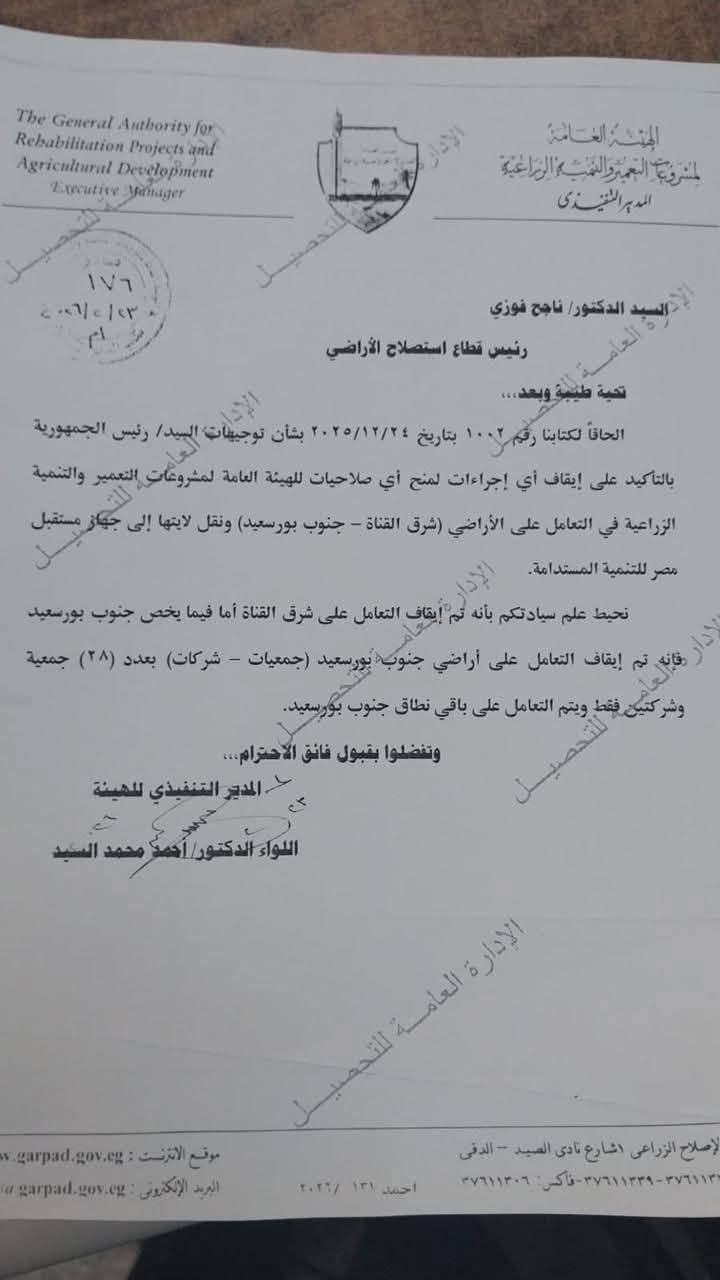 أوضح الخطاب الموجه إلى رئيس قطاع استصلاح الأراضي، الدكتور ناجح فوزي، أن الهيئة بدأت بالفعل في تنفيذ إجراءات وقف التعامل، مما يعني أن كافة الطلبات أو الإجراءات القانونية المتعلقة بالأراضي المذكورة (خاصة شرق القناة والـ 28 جمعية بجنوب بورسعيد) ستنتقل مسؤوليتها وإدارتها بالكامل إلى جهاز مستقبل مصر للتنمية المستدامة.