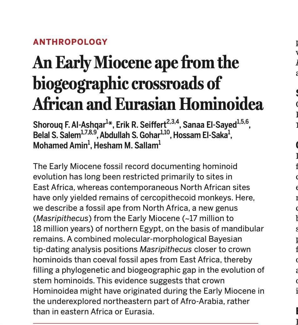 تناول البحث المنشور نوعاً جديداً من أسلاف القردة العليا عاش خلال عصر الميوسين المبكر. الحفريات التي عُثر عليها في منخفض المغرة بالصحراء الغربية أثبتت أن شمال إفريقيا لم يكن مجرد ممر جغرافي، بل كان موطناً رئيسياً ونقطة انطلاق لتطور القردة العليا.