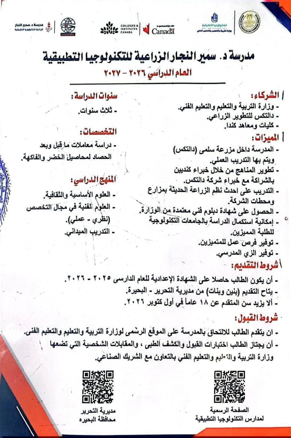 أعلنت مدرسة سمير النجار الزراعية للتكنولوجيا التطبيقية عن فتح باب التقديم للطلاب الحاصلين على الشهادة الإعدادية للعام الدراسي 2025/2026، للالتحاق بالمدرسة اعتبارا من العام الدراسي الجديد 2026/2027، وذلك في إطار التوسع في مدارس التكنولوجيا التطبيقية وربط التعليم الفني بسوق العمل.