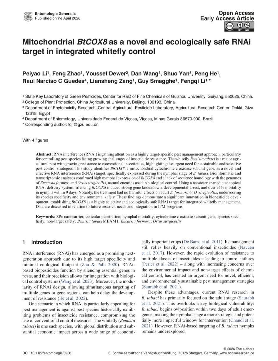 “Mitochondrial BtCOX8 as a novel and ecologically safe RNAi target in integrated whitefly control”