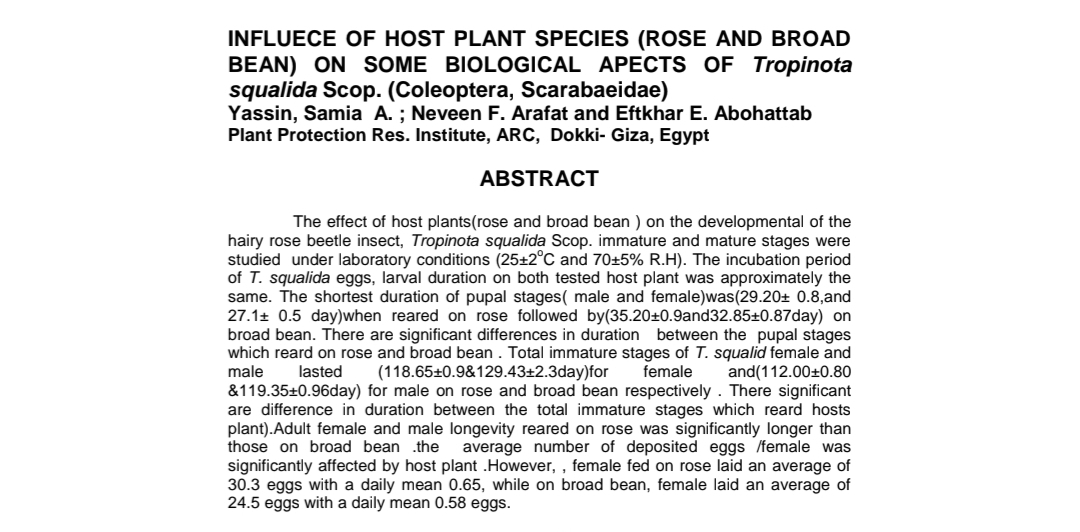 أجرى باحثون في معهد بحوث وقاية النباتات التابع لمركز البحوث الزراعية في مصر دراسة مهمة حول تأثير نوع العائل النباتي على النمو الحيوي لحشرة "جعل الورد الزغبي" (Tropinota squalida Scop.). وأظهرت النتائج أن نبات الورد يُعد البيئة المثالية لتطور هذه الآفة مقارنة بالفول البلدي، ما يبرز خطورتها على محاصيل الزينة والزراعة في مصر.